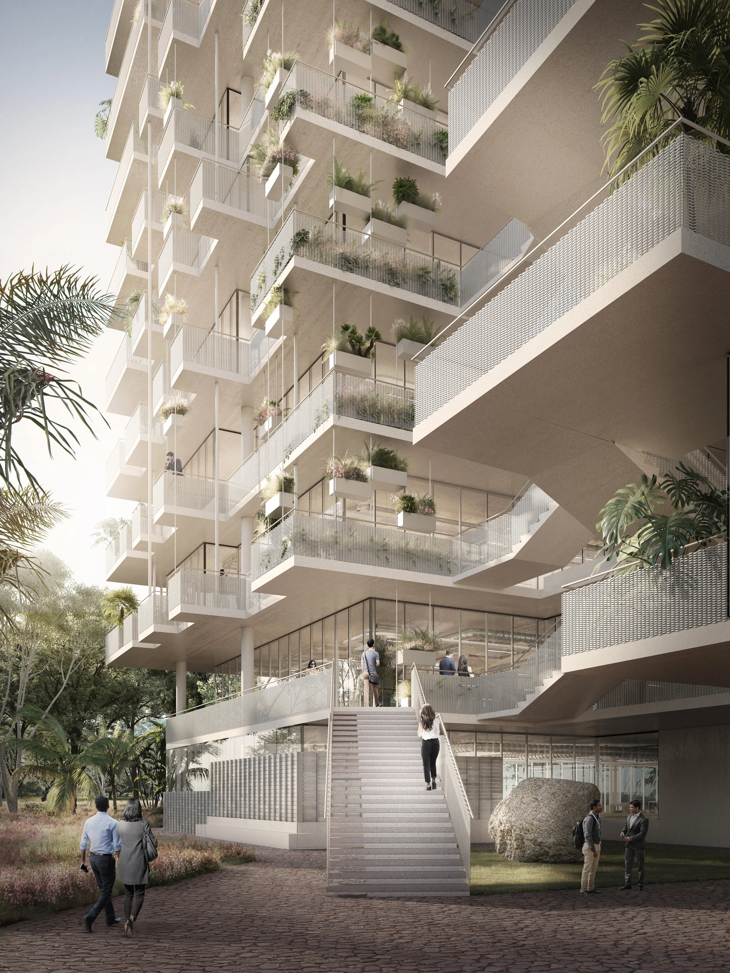 In contrast, this design resolves the common pitfalls of the office building typology by carving a centralized arrival courtyard that merges with staggered balconies wrapping the entire building.